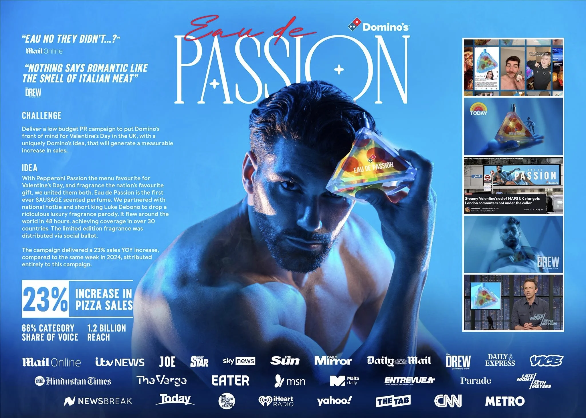 This Valentine’s Day, Domino’s UK and Ireland launched a limited-edition pepperoni-scented perfume called Eau de Passion. Described as having peppery, spicy notes with a warm, woody base, the fragrance was promoted as the perfect gift for pizza-loving couples.