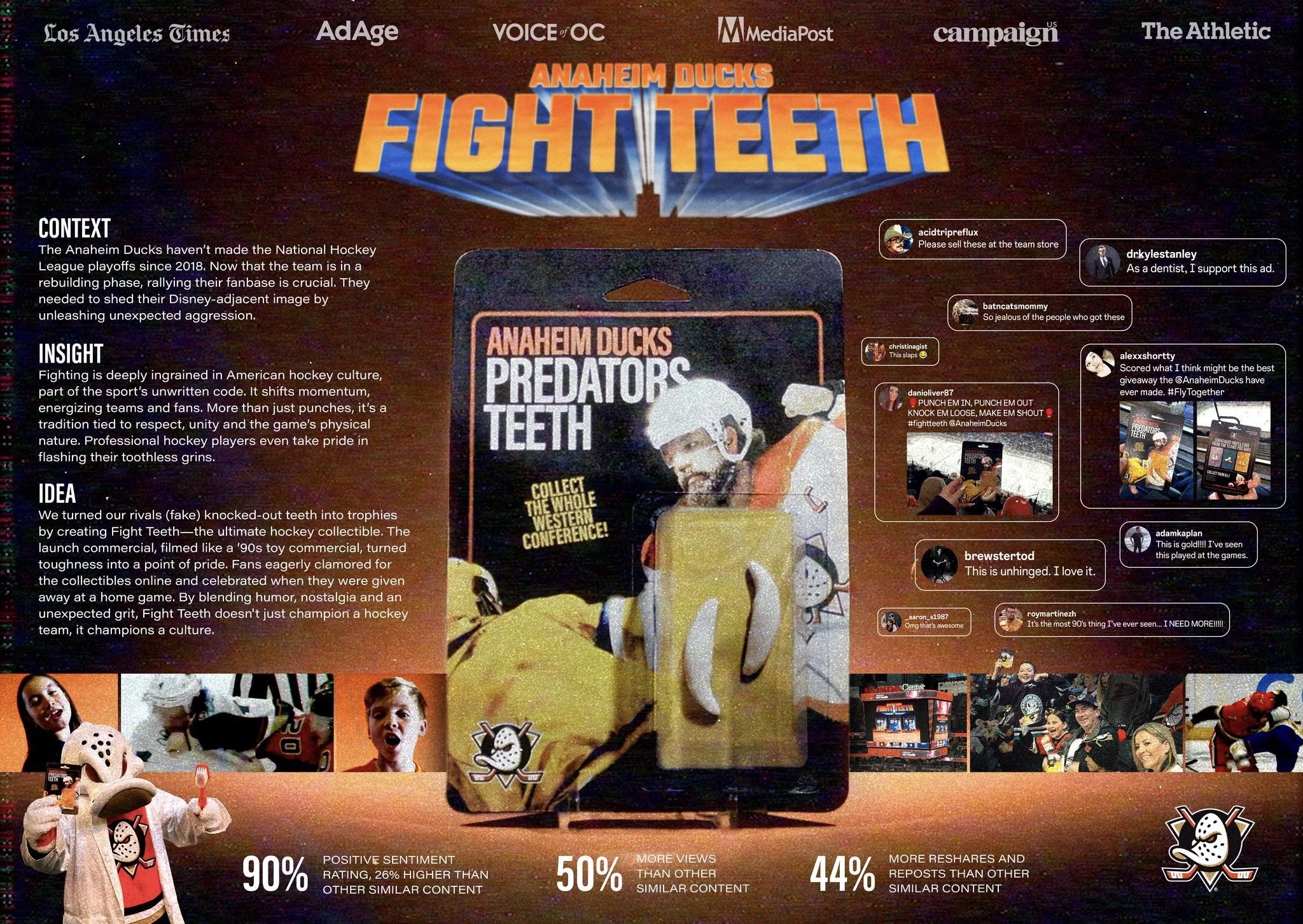 The NHL’s Anaheim Ducks are quacking back this season by expanding the world of "Orange Country"—a bold, gritty take on Ducks fandom. Their latest spot, "Fight Teeth," taps into nostalgic toy commercials with a kid-sung jingle and a playful edge, encouraging fans to “collect them all” while nodding to rivals like the Sharks and Knights. Created with AOR Battery, the campaign reinforces the Ducks’ new platform, “You’re Entering Orange Country,” and positions the team as fierce defenders of their home ice. Through broadcast, DOOH, and social, the Ducks reclaim Orange County stereotypes and flip familiar insults into rallying cries, uniting fans under a single mission: to proudly defend Orange Country.
